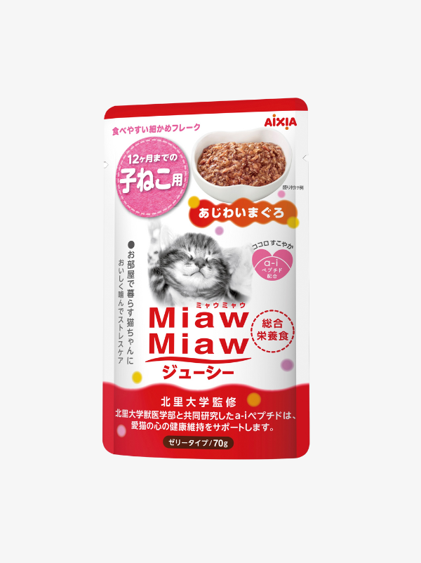 A delicious juicy jelly type retort pouch. A comprehensive nutritional diet containing “ai peptide” in consideration of maintaining the mental health of your cat living in your room.