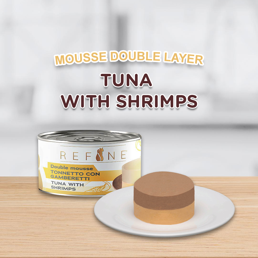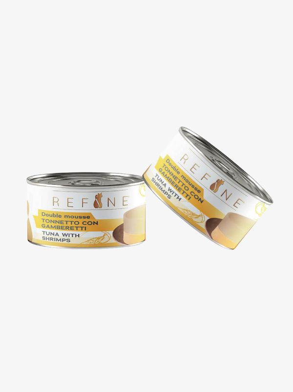 The REFINE Mousse Double Tuna with Shrimp captures the essence of the sea in every bite. Tuna, rich in noble proteins and omega-3, combines with shrimp, with their refined high biological value protein content and lightness. This delicious recipe offers a harmony of proteins and an explosion of flavors that your cat will adore, making every bite an unforgettable journey.