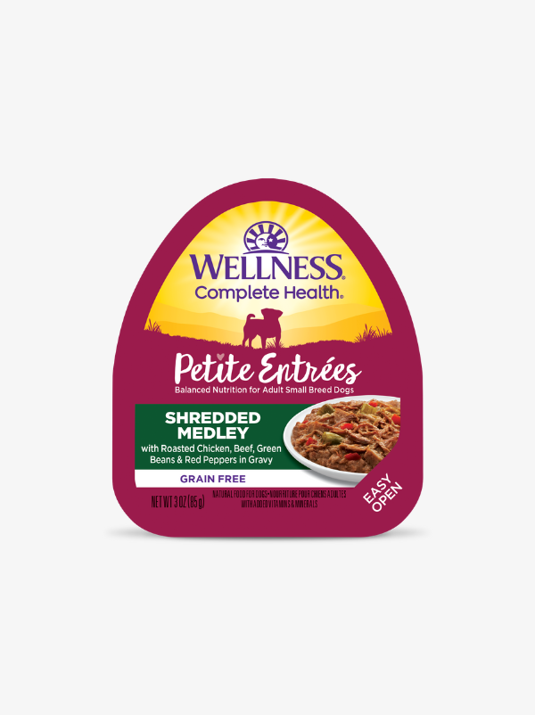 The Wellness Petite Entrees Shredded Medley (Roasted Chicken, Beef, Green Beans & Red Peppers) Wet Dog Food is specially created for petite and small breed dogs. With each flavorful bite, your dog will enjoy mouthwatering cuts of meat and vegetables for a unique protein combination that’s sure to please even finicky eaters. Wholesome veggies and added vitamins and minerals provide additional nutrients to meet the specific dietary needs of small breed dogs.